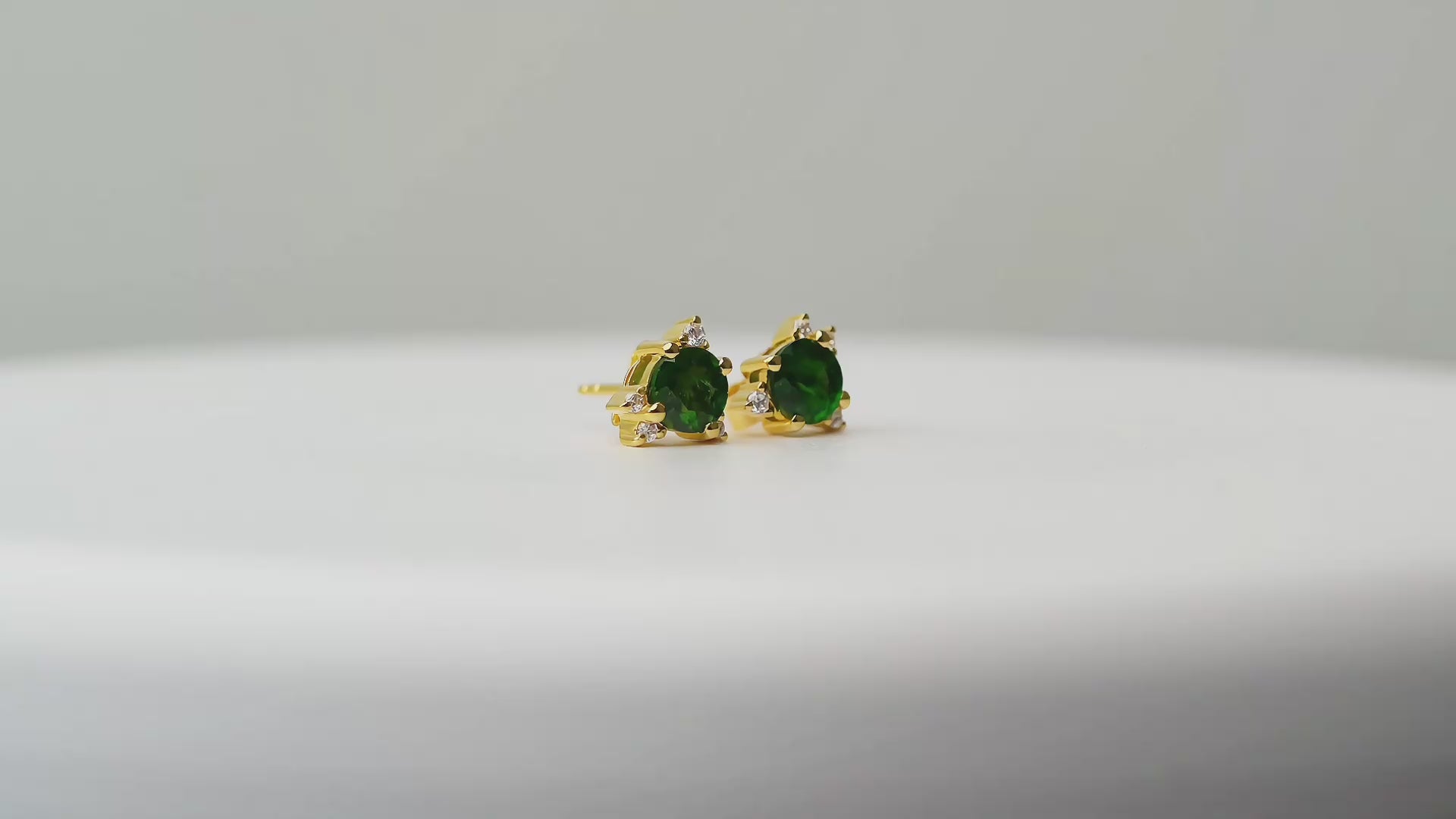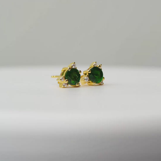 Deze oorbellen vangen de essentie van natuurlijke kracht in een verfijnd ontwerp. Gemaakt van sterling zilver met een laag goudvermeil, en bezet met een intens groene chrome diopside, omlijst door heldere witte topaas.